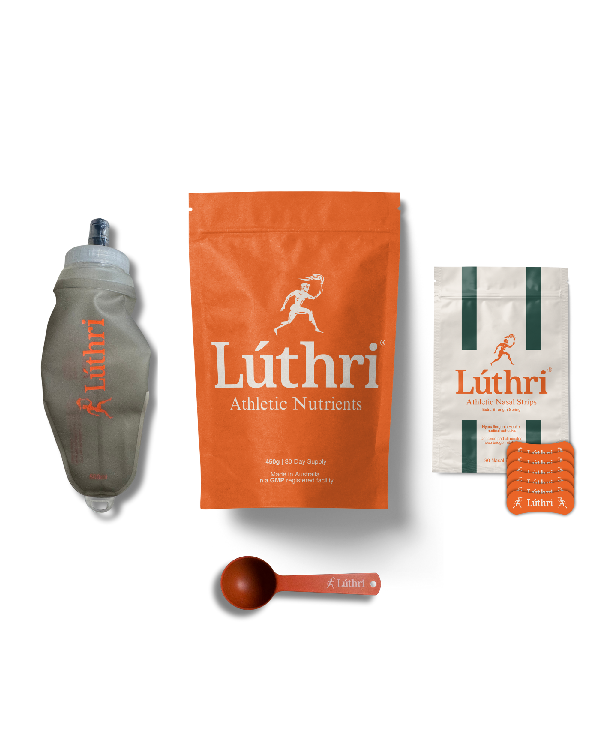 30 days of Lúthri Athletic Nutrients + 30 Lúthri Athletic Nasal Strips + the Lúthri Torchbearer Hydration Bottle + the Lúthri Stainless Steel Scoop